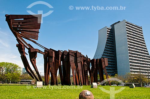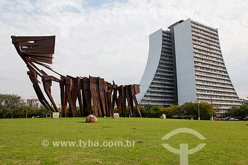 Monumento aos Açorianos (1974) com Centro Administrativo do Estado do Rio Grande do Sul (CAERGS) - também conhecido como Centro Administrativo Fernando Ferrari ao fundo - Porto Alegre - Rio Grande do Sul (RS) - Brasil