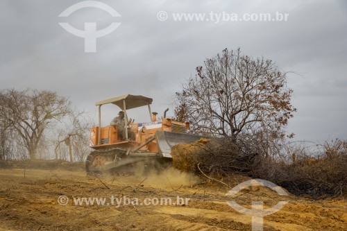 Máquina motoniveladora limpando terreno queimado por incêndio ilegal para plantio de capim brachiaria - Guarani - Minas Gerais (MG) - Brasil