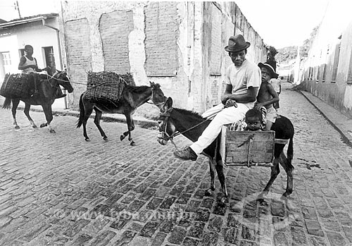 Caixeiro-viajante carregando criança em bruaca - bolsa feita de couro - Cachoeira - Bahia (BA) - Brasil