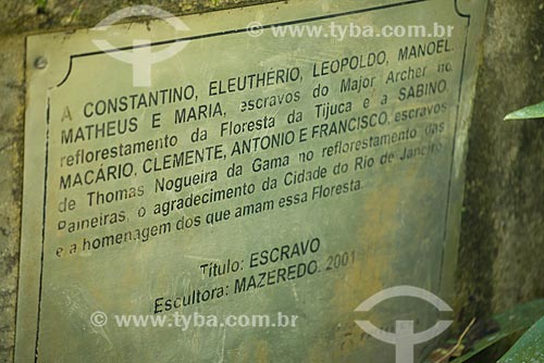 •  Assunto: Placa no Monumento ao Escravo (2001) - monumento em homenagem aos escravos que ajudaram no reflorestamento da Floresta da Tijuca / Local: Rio de Janeiro (RJ) - Brasil / Data: 08/2013