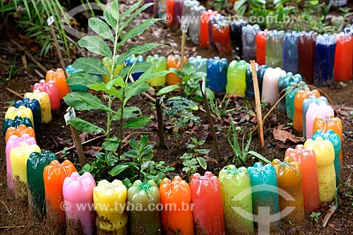 Reaproveitamento de garrafas PET e pneus na criação de horta medicinal no jardim da sede da Fundação Almerinda Malaquias - ONG Organização não-governamental - Novo Airão - Amazonas (AM) - Brasil