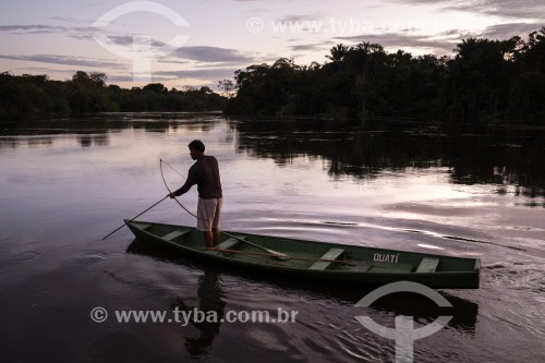 • Homem navegando ao nascer do sol - Reserva de Desenvolvimento Sustentável Mamirauá - Alvarães - Amazonas (AM) - Brasil