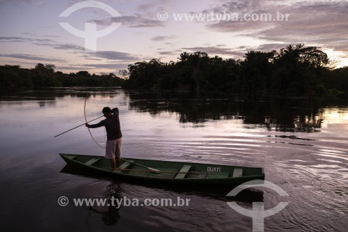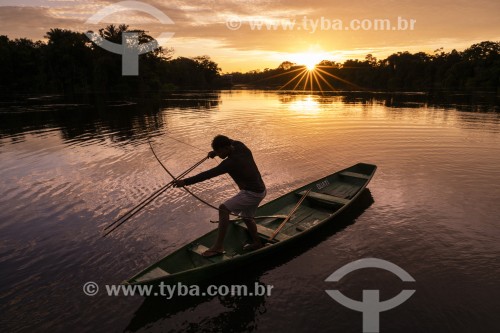Indígena pescando com arco e flecha ao nascer do sol - Reserva de Desenvolvimento Sustetável Mamirauá - Alvarães - Amazonas (AM) - Brasil