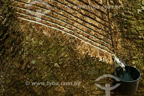 •  Assunto: Seringueiro colhendo latex natural para a fabrica de preservativos Natex / Local: Xapuri - Acre (AC) - Brasil / Data: 10/07/2008