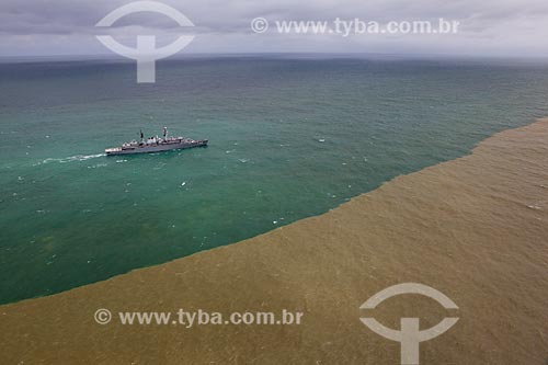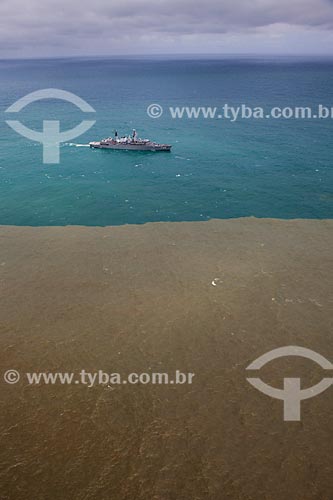 Foto aérea Navio Patrulha F Rademaker (P-49) com a lama chegando ao mar pelo Rio Doce após rompimento da barragem de rejeitos de mineração da empresa Samarco - Linhares - Espírito Santo (ES) - Brasil