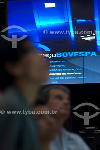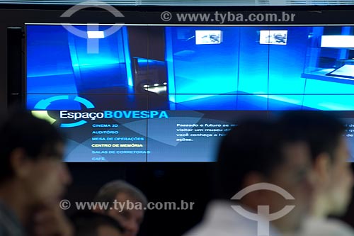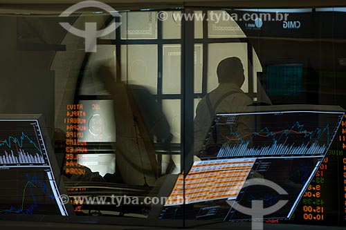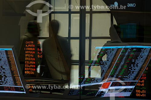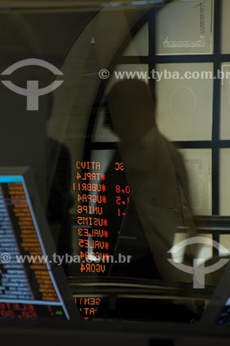 •  Assunto: Painel eletrônico de cotações da bolsa de valores de São Paulo (BOVESPA) refletido em vidro com operadores de mercado ao fundo / Local: São Paulo - SP / Data: 09/2008