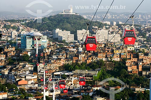 Gôndolas do Teleférico do Alemão - operado pela SuperVia - com a Igreja de Nossa Senhora da Penha ao fundo - Rio de Janeiro - Rio de Janeiro - Brasil
