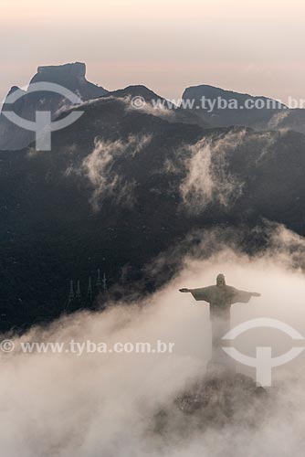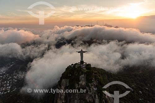 Foto aérea do Cristo Redentor durante o pôr do sol com nevoeiro - Rio de Janeiro - Rio de Janeiro (RJ) - Brasil