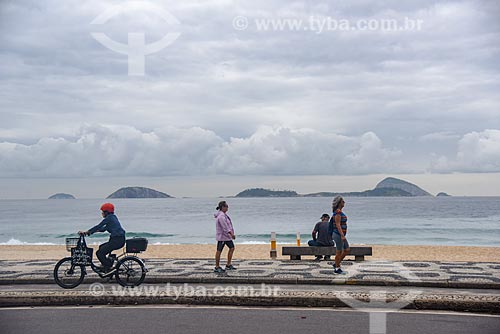 Ciclista e pedestres em ciclovia na orla da Praia do Leblon com o Monumento Natural das Ilhas Cagarras ao fundo - Rio de Janeiro - Rio de Janeiro (RJ) - Brasil