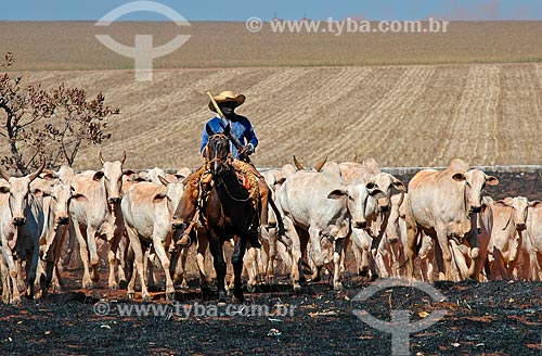 •  Peão e gado sobre vegetação queimada com plantação de soja ao fundo próximo ao Parque Nacional das Emas  - Mineiros - Goiás (GO) - Brasil