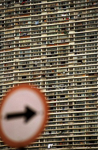 •  Fachada de prédio de população de baixa renda com placa de trânsito em primeiro plano - São Paulo - SP - Brasil  - São Paulo - São Paulo - Brasil