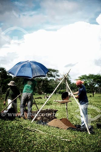 Ribeirinho e seu filho produzindo de farinha na Comunidade Ribeirinha do Bom Jesus na Reserva de Desenvolvimento Sustentável de Uacari - Carauari - Amazonas (AM) - Brasil