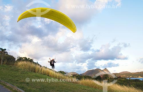 Assunto: Homem voando de parapente em pequeno morro entre as praias de Piratininga e Camboinhas / Local: Niterói - RJ - Brasil / Data: Junho de 2009