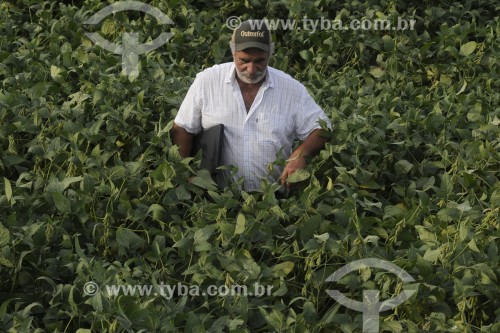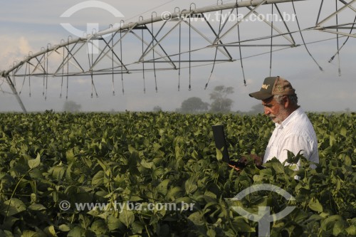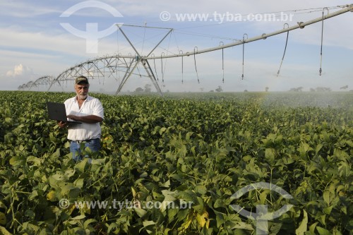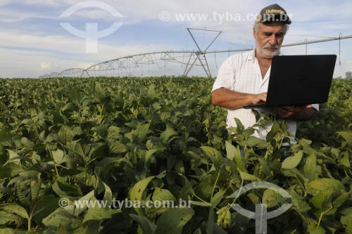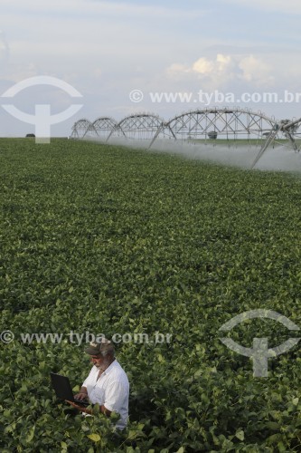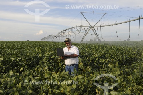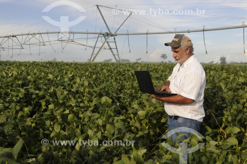 • Agricultor utilizando computador no campo em meio a plantação de soja - Buritama - São Paulo (SP) - Brasil