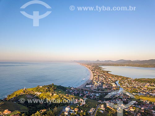 •  Vista de casas no distrito de Ponta Negra entre ao mar e a Lagoa de Guarapina durante o pôr do sol  - Maricá - Rio de Janeiro (RJ) - Brasil