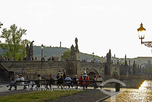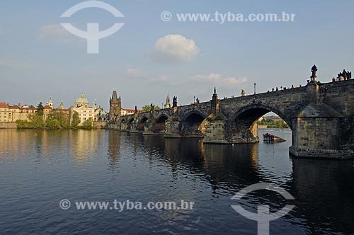 Turistas na Karluv most (Ponte Carlos) - mais antiga ponte de Praga com o Rio Moldava - Praga - Região da Boêmia Central - República Tcheca