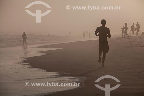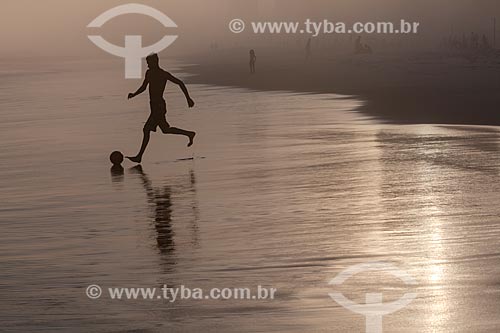 •  Assunto: Jovem jogando futebol na Praia da Barra da Tijuca durante maresia no inverno / Local: Barra da Tijuca - Rio de Janeiro (RJ) - Brasil / Data: 07/2013