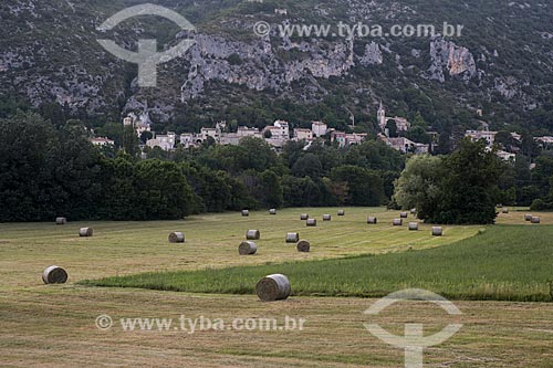 Colheita do feno com a cidade de Monieux ao fundo - Monieux - Departamento de Vaucluse - França