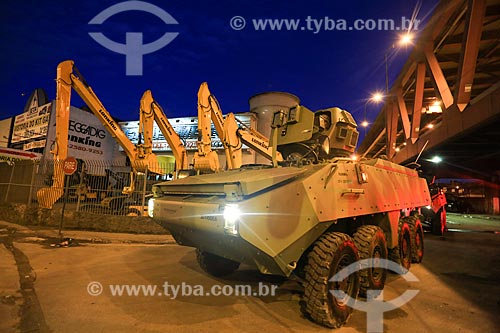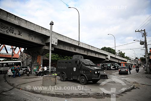 Veículo blindado da Polícia Militar durante o início da instalação da Unidade de Polícia Pacificadora (UPP) no conjunto de favelas do Complexo do Caju e Comunidade da Barreira do Vasco na zona norte do Rio de Janeiro - Rio de Janeiro - Rio de Janeiro - Brasil