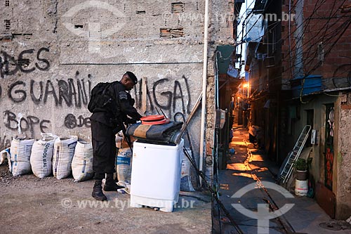 •  Policial da Polícia Militar durante o início da instalação da Unidade de Polícia Pacificadora (UPP) no conjunto de favelas do Complexo do Caju e Comunidade da Barreira do Vasco na zona norte do Rio de Janeiro    - Rio de Janeiro - Rio de Janeiro - Brasil