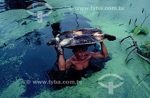 •  Assunto: Homem resgatando animais (tartarugas) na inundação da construção da Hidroelétrica Balbina / Local: Amazonas - Brasil / Data: Década de 80