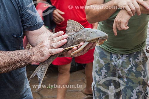 Detalhe de Cascudo (Hypostomus affinis) - também conhecido como acari ou bodó - resgatado durante a operação Arca de Noé - operação para coletar peixes no Rio Doce e transportá-los para tanques antes da chegada da lama contaminada por metais pesados como arsênio, cádmio, chumbo, cromo e níquel - Colatina - Espírito Santo (ES) - Brasil