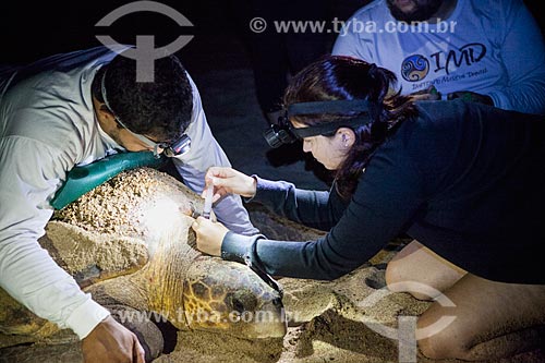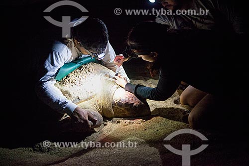 Voluntários do Projeto TAMAR examinando tartaruga marinha - Linhares - Espírito Santo (ES) - Brasil