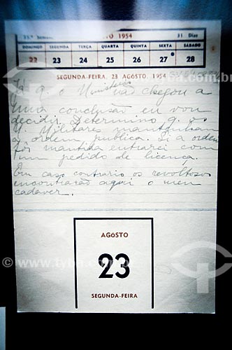 •  Anotação feita por Alzira Vargas durante a última reunião ministerial, registrando a decisão de Getúlio Vargas de se licenciar da Presidência da República em exposição no Quarto de Getúlio Vargas do Museu da República - antigo Palácio do Catete  - Rio de Janeiro - Rio de Janeiro - Brasil