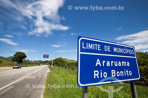 •  Assunto: Placa indicando a divisa entre Araruama e Rio Bonito na Rodovia RJ-124 (Via Lagos) / Local: Rio de Janeiro (RJ) - Brasil / Data: 12/2013