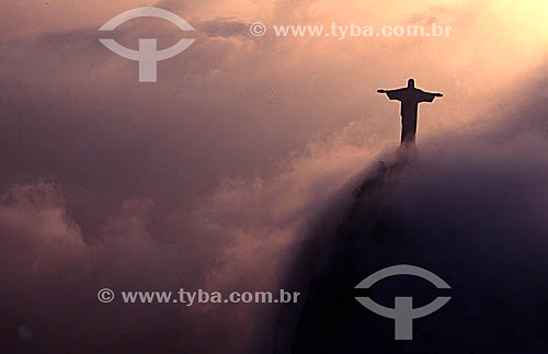 •  Silhueta do Cristo Redentor envolto em nuvens iluminadas pelo reflexo do pôr-do-sol - Rio de Janeiro - RJ - Brasil  - Rio de Janeiro - Rio de Janeiro - Brasil