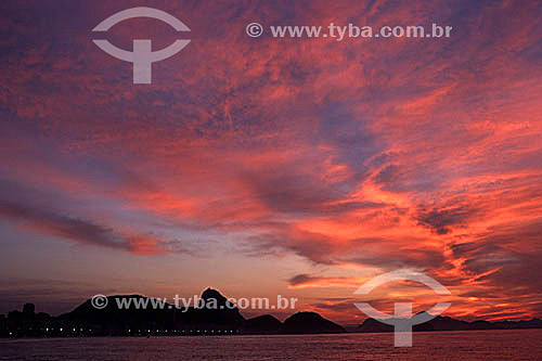 •  Silhueta do Pão de Açúcar na Baía de Guanabara com nuvens iluminadas e coloridas pelo reflexo do pôr-do-sol - Rio de Janeiro - RJ - Brasil  - Rio de Janeiro - Rio de Janeiro - Brasil