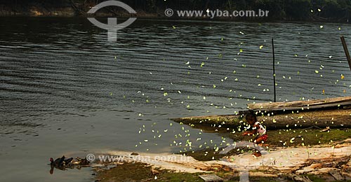Criança ribeirinha às margens do Rio Igapó-Açu brincando com as borboletas - Manaus - Amazonas (AM) - Brasil
