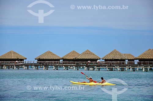 Assunto: Casal em um caiaque com os bangalores de um resort ao fundo / Local: Ilha Huahine - Polinésia Francesa - Oceania / Data: 10/2012