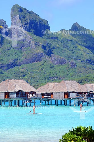 •  Assunto: Casal praticando o Paddle Surf com os bangalores de um resort e o Monte Otemanu ao fundo / Local: Ilha Bora Bora - Polinésia Francesa - Oceania / Data: 10/2012