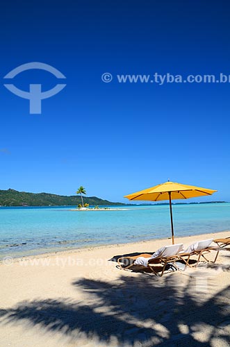 •  Assunto: Cadeira e barraca de praia com pequena ilha ao fundo / Local: Ilha Bora Bora - Polinésia Francesa - Oceania / Data: 10/2012