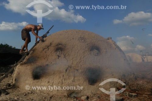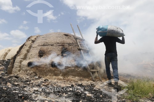 Trabalhador e forno usado na produção de carvão vegetal - Rorainópolis - Roraima (RR) - Brasil