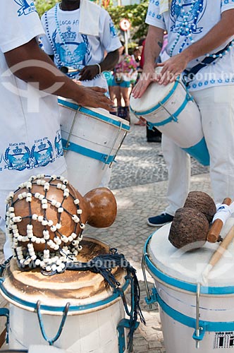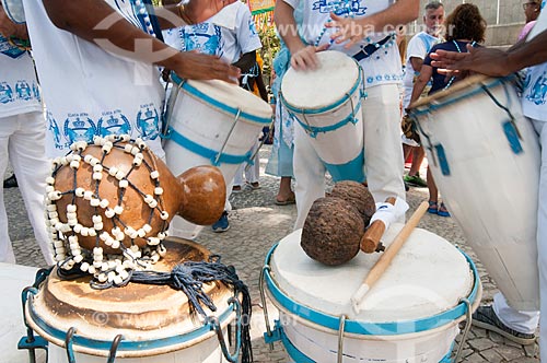Detalhe de xequerê - à esquerda - e agogô - à direita - durante a concentração do bloco de carnaval de rua Afoxé Ilê Alá na Avenida Atlântica - Rio de Janeiro - Rio de Janeiro (RJ) - Brasil