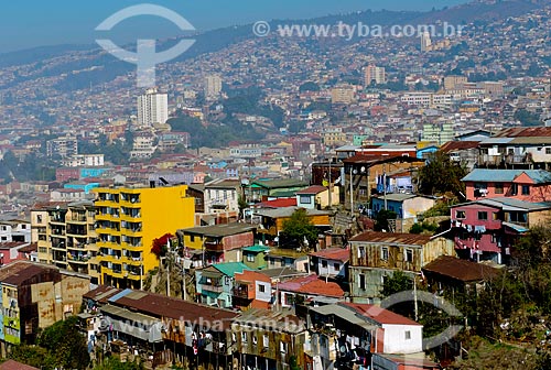 Assunto: Casas no Cerro Santo Domingo (Morro Santo Domingo) com Cerro Cordillera (Morro Cordilheira) ao fundo / Local: Valparaíso - Chile - América do Sul / Data: 05/2013