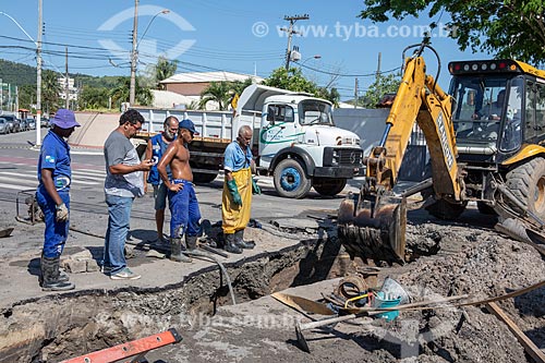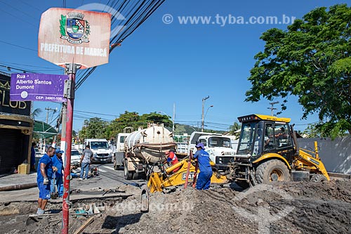 •  Funcionários da Companhia Estadual de Águas e Esgotos (CEDAE) fazendo o reparo na tubulação de esgoto por entupimento de gordura na esquina da Rua Rua Alberto Santos Dumont com a Rua Álvares de Castro  - Maricá - Rio de Janeiro (RJ) - Brasil