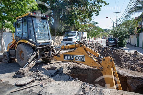 Escavadeira da Companhia Estadual de Águas e Esgotos (CEDAE) fazendo o reparo na tubulação de esgoto por entupimento de gordura na esquina da Rua Rua Alberto Santos Dumont com a Rua Álvares de Castro - Maricá - Rio de Janeiro (RJ) - Brasil