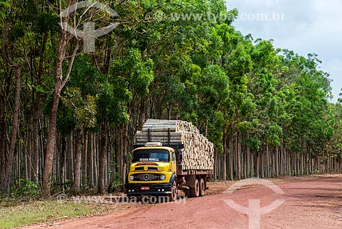 •  Transporte de troncos de Paricá (Schizolobium parahyba var amazonicum) com caminhão e árvores de mogno (Swietenia macrophylla) ao fundo  - Paragominas - Pará (PA) - Brasil