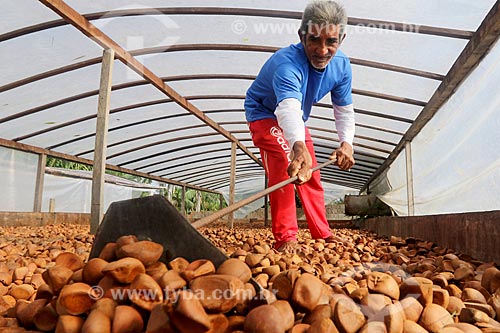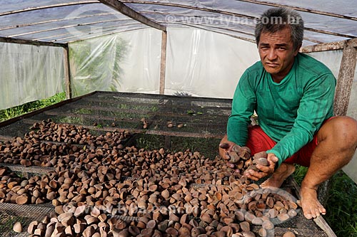 Produtor rural durante secagem da semente de andiroba na Reserva de Desenvolvimento Sustentável de Uacari - Carauari - Amazonas (AM) - Brasil