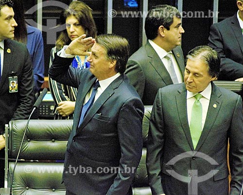 Presidente Jair Bolsonaro prestando continência ao lado do Senador Eunício Oliveira - presidente do Senado Federal - no plenário da Câmara dos Deputados durante a cerimônia de posse presidencial - Brasília - Distrito Federal (DF) - Brasil