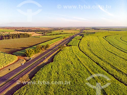 •  Foto feita com drone da Rodovia Mario Donega (SP-291) em meio à canavial  - Ribeirão Preto - São Paulo (SP) - Brasil