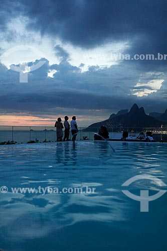 •  Silhueta de pessoas aproveitando o entardecer na cobertura do Hotel Fasano na orla de Ipanema - com piscina em primeiro plano e Morro Dois Irmãos ao fundo - uso somente sob consulta prévia   - Rio de Janeiro - Rio de Janeiro - Brasil