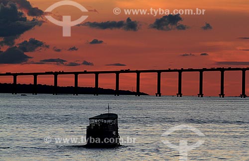 Assunto: Barco navegando no fim de tarde ao fundo ponte Rio Negro Essa ponte liga Manaus a Iranduba / Local: Manaus - Amazonas (AM) - Brasil / Data: 03/2011