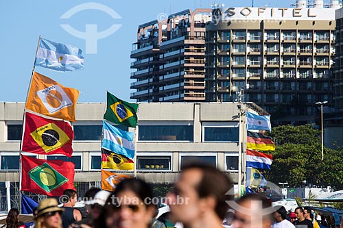 •  Banhistas na Praia de Copacabana - Posto 5 - com estúdios temporários de televisão instalados durante a Copa do Mundo no Brasil ao fundo  - Rio de Janeiro - Rio de Janeiro (RJ) - Brasil