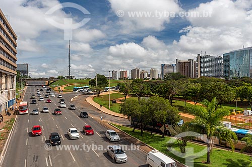 Tráfego em avenida no centro de Brasília com a Torre de TV de Brasília ao fundo - Brasília - Distrito Federal (DF) - Brasil