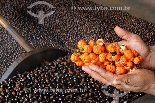 •  Sementes torradas do Guaraná (Paullinia cupana) com mão segurando um cacho do fruto colhido pelos ribeirinhos  - Maués - Amazonas (AM) - Brasil