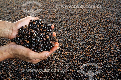 •  Processo de torrefação das sementes do guaraná (Paullinia cupana) com mão segurando um cacho dos frutos colhidos pelos ribeirinhos  - Maués - Amazonas (AM) - Brasil